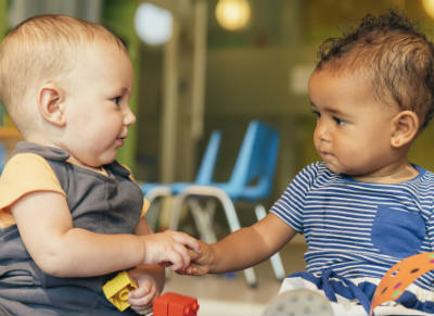 ParentingScience.com also recommends you have your toddler “engage in playful acts of reciprocity.” These can include rolling a ball back and forth with another person, taking turns pressing a toy button or even simply handing a toy to one another. In a study where an adult previously unknown to the child participated in this type of play, the toddlers began to “respond to their new playmate as a person to help and share with.” In contrast, when a toddler played next to a stranger, this effect didn’t take place.